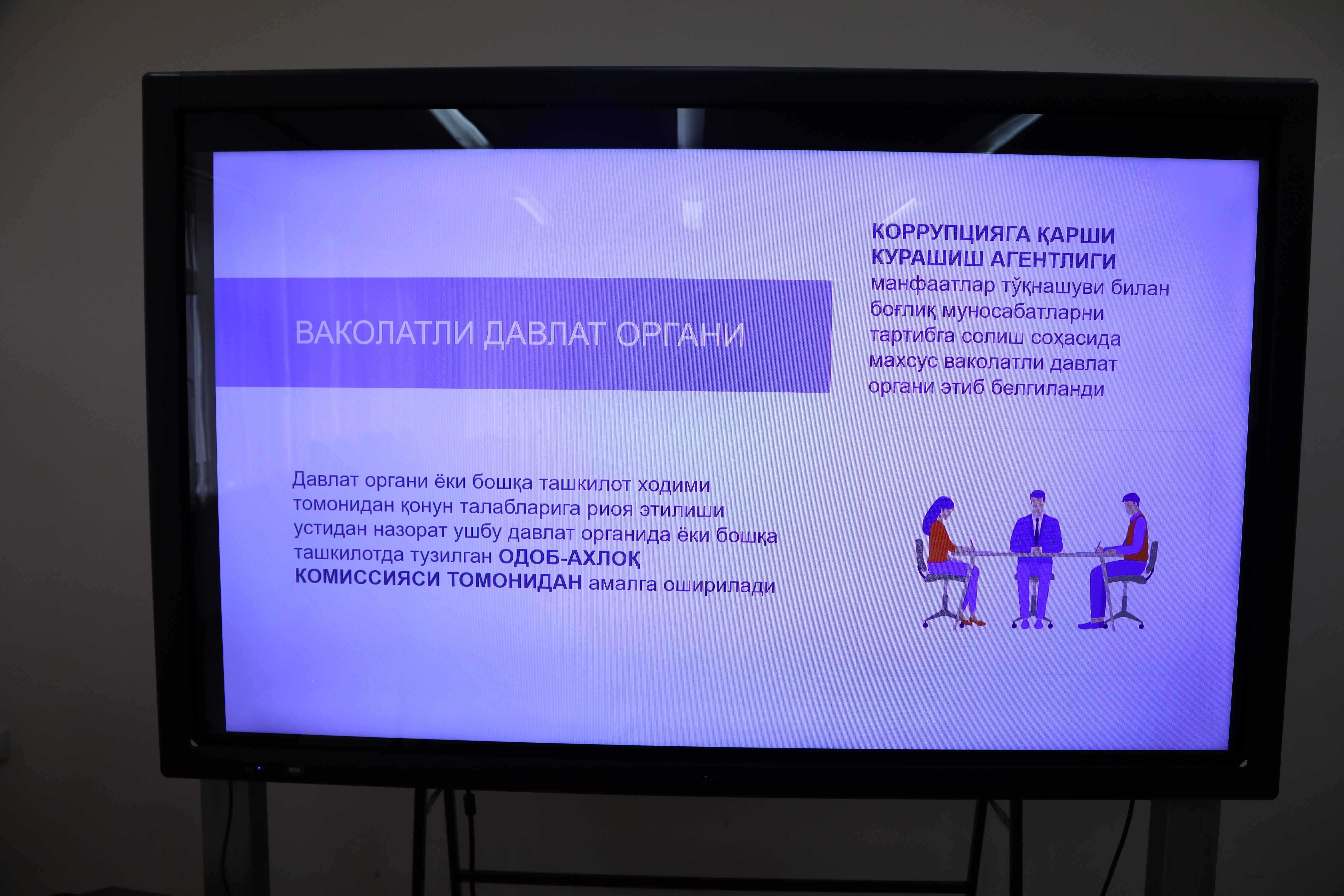 Bundan tashqari, tadbir qatnashchilariga “Manfaatlar to‘qnashuvi” to‘g‘risidagi Qonunning mazmun-mohiyati va ahamiyati qo‘shimcha ravishda tushuntirildi.