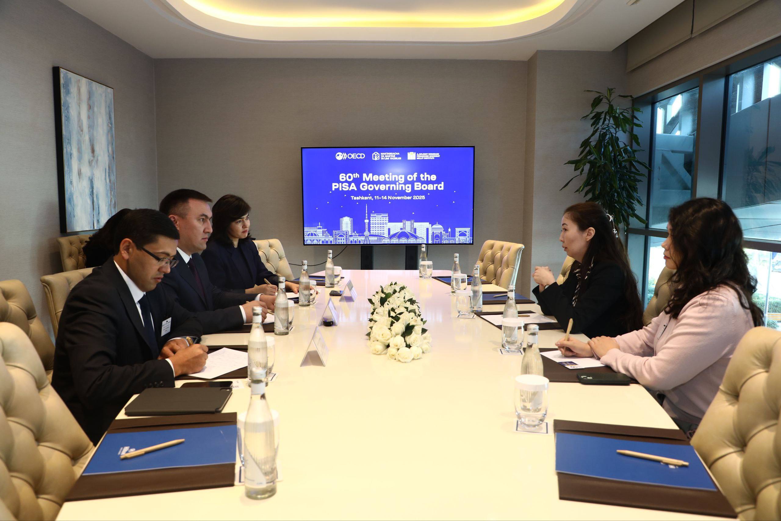 PISA Boshqaruv kengashining 60-yubiley sessiyasi doirasida Qozog‘iston Respublikasi Taldau Ta’lim tadqiqotlari va baholash milliy markazi rais o‘rinbosari Aygerim Kopeyeva hamda Xalqaro tadqiqotlar departamenti direktori o‘rinbosari Assem Julbarisovalar bilan uchrashuv o‘tkazildi.