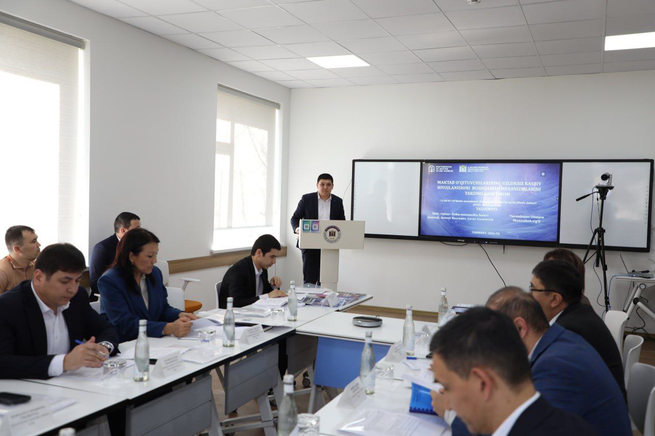 Institut tayanch doktoranti Tursinboev Olimjon Shuxratbek o‘g‘lining “Maktab o‘qituvchilarining uzluksiz kasbiy rivojlanishini boshqarish mexanizmlarini takomillashtirish" hamda institut mustaqil izlanuvchisi Palvannazirov Sardorbek Xamrobek o‘g‘lining “Umumta‘lim muassasalarida ta‘lim sifatini oshirishning boshqaruv mexanizmlarini TIMSS xalqaro baholash dasturi asosida takomillashtirish” mavzusidagi PhD ilmiy darajasiga oid tadqiqotlari muhokamadan o‘tkazildi.