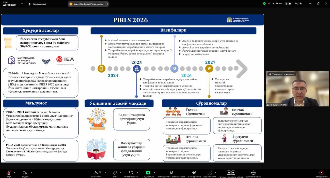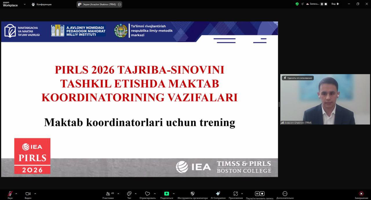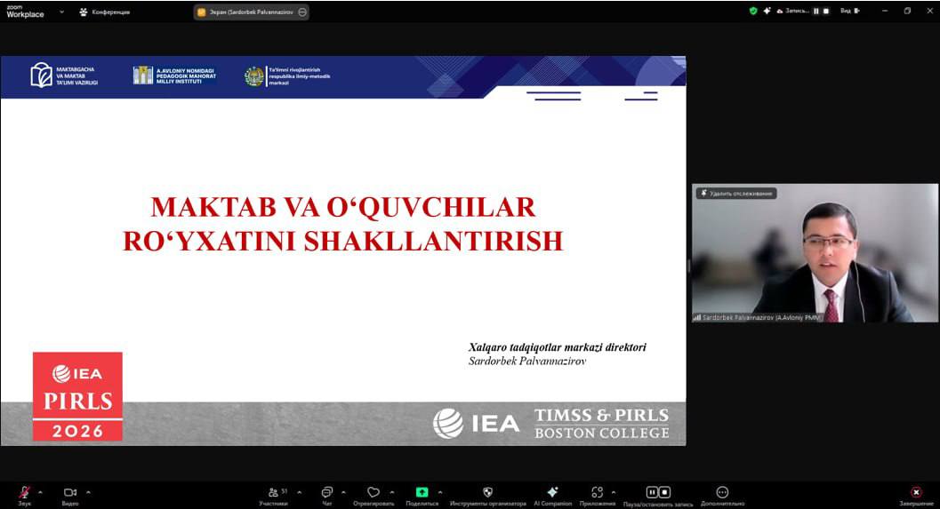 Maktabgacha va maktab ta‘limi vazirligi, A.Avloniy nomidagi pedagogik mahorat milliy instituti hamda Ta‘limni rivojlantirish respublika ilmiy-metodik markazi tomonidan PIRLS 2026 xalqaro tadqiqotining tajriba-sinov jarayoniga tayyorgarlik doirasida "Maktab koordinatorlarining vazifalari" mavzusida vebinar-trening o‘tkazildi.
